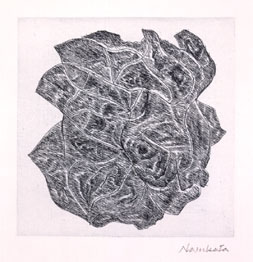 難波田龍起 Tatsuoki NAMBATA W004 《古代を想う D》(単色刷り) 1995年 銅版(単色刷り) 15.0×15.0cm Ed.6/35〜35/35 サインあり ◆《難波田龍起銅版画集 古代を想う》B版・C版の中の1点。 |