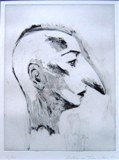 また、物故作家としては1997年に「瑛九作品集」(日本経済新聞社刊)の発売を記念して「瑛九作品展」を開催し、油彩やフォトデッサンを含め、25点を展示した。瑛九は晩年、経済的に困窮するなか、命を削りながらすばらしい作品を残しているが、その時代、支えていたのが福井で創美活動・小コレクター運動を推進していた先生方であったことはあまり知られていない。福井で何回か瑛九頒布会が行われ、売れた代金が瑛九の作品制作と生活を支えた。「小コレクターの会運動」の志を実行した我がふるさとの先輩達を誇りに感じている。 90年代の私にとってのトピックスは舟越桂及び小野隆生との出会いだ。彫刻も含め、舟越作品には大いに惹かれるものがあった。木彫の遠くを見つめる孤独な眼の魅力が版画にも感じ取れた。1990年の西村画廊の展覧会で銅版画を購入したのが最初のコレクションであった。ぜひとも「アートフル勝山の会」主催の展覧会をやりたいと思い、お願いしたら断られることがないであろう人脈を探索した。たどり着いたのは盛岡第一画廊の上田さんであった。中上先生の奥様とともに、盛岡までお願いに出かけ、幸いにも舟越さんに勝山まで足を運んでもらうことに成功した。版画だけでは迫力に欠けるというので、上田さんから初期の木彫もお借りすることもできた。また、第一画廊で舟越桂の最初の版画セット(銅版画3点)とも出会い、小品の割に高価であったが、作品のすばらしさに惚れ込んでコレクションに加えた。企画展は新作版画のセット(10点)を画廊からアートフル勝山の会が買い取る形での作品展示となったが、おかげさまで全作品が地元に納まった。私のコレクションにはこのうちの2点が仲間入りしている。
