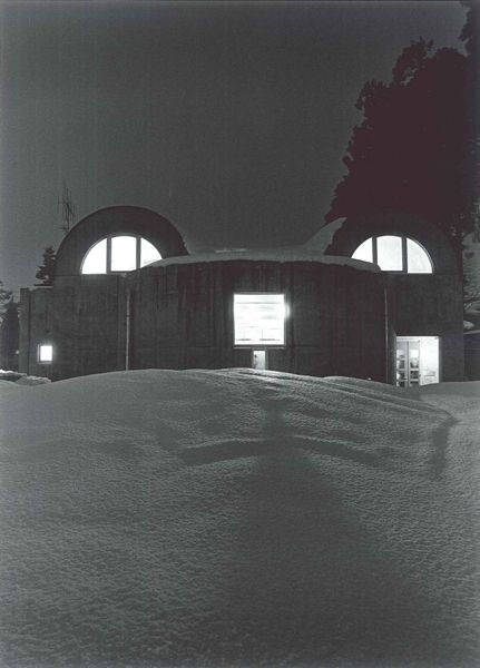 「雪国。そこにはまったく異なる建築的対応が必要とみえるのだが、コンクリートの構造体であるかぎりでは、結露以外に変った条件はない。そこで、手なれたヴォールト屋根をここでも使用する。設計者への注文は、美術愛好家たちのためのサロンをつくることである。壁、天井ともにコンクリート打放しのまま。それに、多くの版画コレクションがかけられる。そして、いまではこの近傍の文化的な中心となりつつある。」