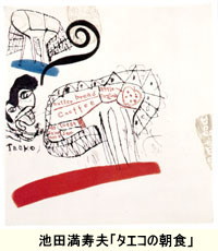 そして最後が泣かせま す。「64年の個展で、今では代表作の一つになっている『タエコの朝食』は、個展会期中では一点しか売れなく、そ の一点は斉藤義重氏が買われたもの だった。・・・」以下略。64年と書いてありますが、誤記か記憶違いで、恐らく 1963年の日本橋画廊での個展と思われますが、いずれにせよ、既に池田さんはスタ ーでした。それでも一般の(?)コレ クターは誰一人買わず、斉藤先生が買ったと いうのが面白いですね。私も初めて知りました。いかにコレクターが 保守的である か、結局高くならないと買わないという普通のコレクター心理をよくあらわしていま す。さらにこのエッセイには「自宅での池田氏夫妻」とキャプションのついた貴重 なスナップ写真も掲載されています。朝食をとるタエコさんでもなければ、最後を看 取ったヨー コさんでもないところが、時代ですね。 続きはまた。 | ![]() ![]() |