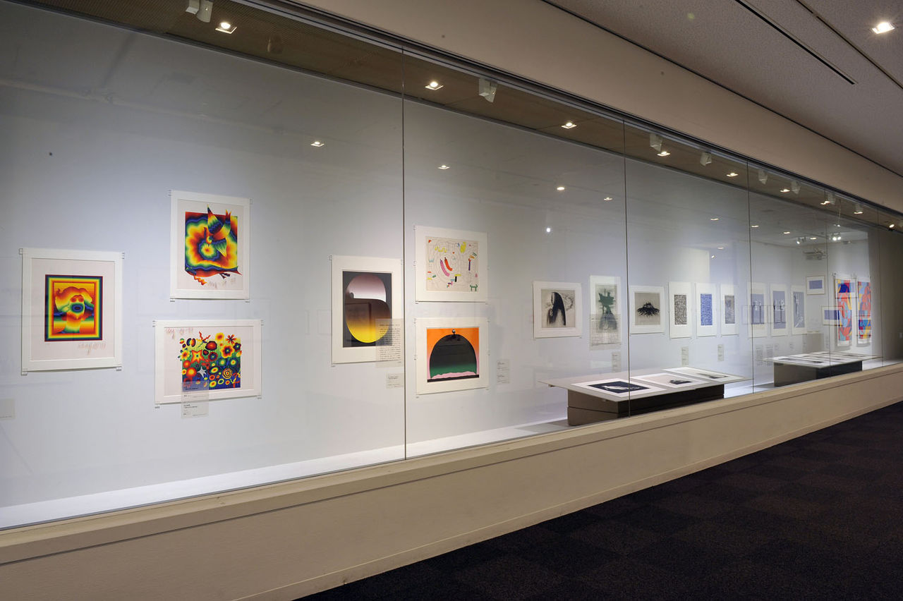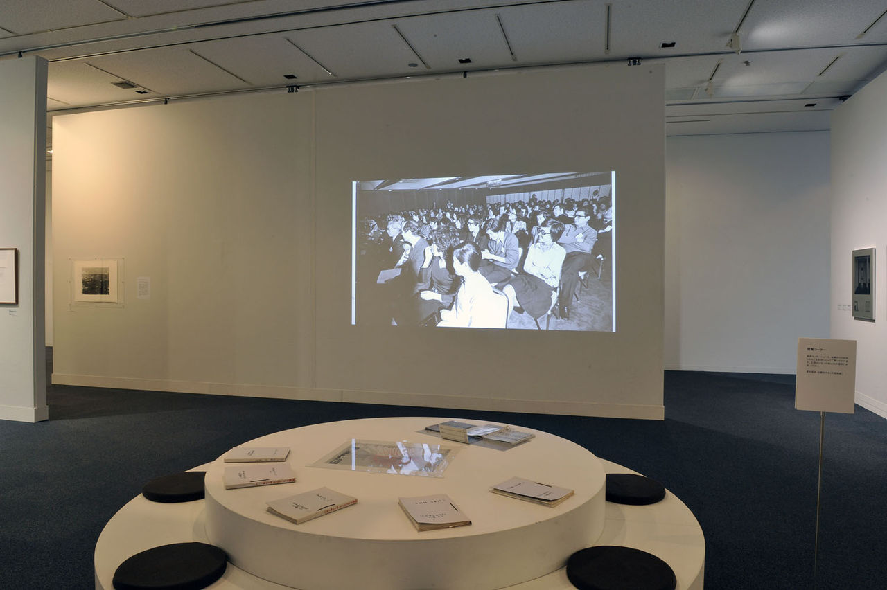 まず、私が声を大にして言いたいのは、これはただの版画展ではないということです。いや、たぶん、この展覧会タイトルをみたら、誰もが版画の展覧会だと思うでしょう。そして会場に並んでいる作品も、基本的には版画作品なのですが、その枠を逸脱するものがあるのです。会場を入ると、靉嘔のシルクスクリーンから展示が始まっています。そこから木村光佑、オノサト・トシノブ……と続いていく展示の流れは、いかにも版画展。小田襄や関根伸夫など立体造形作家による版画に「おや」と思っても、そこまでは基本的に、版画の展覧会です。しかしそのあと、スライド・プロジェクションのコーナーがあります。そこには作品のイメージが投影されているのではなくて、なにやら賑やかに人々の集う展覧会場写真だったり、討論会のようなものの写真だったりが、どんどん映し出されているのです。同時に資料も閲覧できるようになっています。このコーナーを億劫がってよく見ずにとばして、展示作品だけ見てオシマイにしてしまっては、今回の展覧会を楽しんだ、あるいは理解したとはいえません。会場にはこうしたコーナーが3ヶ所あって、とにかくここをじっくり見てほしいのです。
