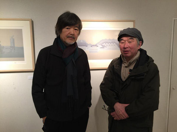 「石山修武・六角鬼丈二人展―遠い記憶の形」が突然始まった。石山は去年の暮れに毛綱毅曠との共著『異形建築巡礼』を上梓したばかり、その出版記念会で彼に会ったばかりで、それから直ぐの二人展は連続しているといっていいのだが、いやそれだけに終わらず今年じゅうに写真家や詩人や建築家たちとのそれぞれ4回にわたる二人展と出版とを続行するつもりだと、石山は書いている。こんな長丁場の連続プロジェクトを思いつくひとは滅多にいない。実行するひとは皆無だ。その圧倒的なパワーによる始動は「突然」と言うしかない。これについてはごく短いけれど何かを断ち切る刃物のような石山の宣言を参照してほしい。こちらは「二人展」を見ての印象。 石山の銅版画は世田谷美術館での大々的な個展(2008年)でたぶん初めて見た。建築家の絵ではない。イメージを融通無礙に捕獲していくその山と海の豊かさがすばらしかった。その後はときの忘れものでの個展でもさらにイメージの展開は終わることがなかった。そして今回の銅版が私はいちばん好きだ。石山は「(サイズが)大きいから」と、それだけを説明していた。たしかに今回つくられた作品の半数近くがこれまでにない大きさによって縦づかいなら高みに飢えた登攀力、横づかいなら遠くまで進む持続力が増しているのが画面に見える。版を彫る道具もニードルだけでなくノミまで用いたという。その荒々しいテクスチャからどの作品にも大小さまざまの足が、それもテクスチャの一部のように強い表情でゾロッと現れている。あとになって作品の写真がときの忘れものから送られてきたとき初めてそれぞれの絵柄がわかったほどに、テクスチャの強さが構図そのものをはるかに凌駕していた。それは長いあいだその旅行きを語りつがれてきた物語に登場する足男たちの肖像画集でもあったのだ。つまり今回の銅版シリーズではとても意識的なテーマでおさえこんだために、これまでにない強靭な、石山という建築家ならびにその肩書をもぎとる何者かにいきなり向かいあわされている。 制作年2016となっている石山の銅版にたいして、その石山から声をかけられた六角のシルクスクリーンは二人展オープニングの1月10日に制作年2017。インクの香がまだ濃い。そして摺られているのは期待に違わず、現実の建築作品をベースにしたもので、たとえば「奇想流転(奇合建築)」は1970年代後半から80年代前半にかけて六角が設計した京都の幼稚園・プレイスクール・工作棟、福岡の金光教教会、札幌の鐘楼展望塔などの屋根伏図を集中合体させた建築図面で、その異様な密度は現実の建築を超えた場所に見る者を誘いこんで帰さない。幼稚園や金光教教会の個々の姿は立面図として取り出され、並べて展示されている。精妙に刷り重ねられたインクは、立体化し、同時になにも見えない光沢面をつくり出す。 軽快なタッチによる「みみ」のシリーズは90年代はじめに東京・杉並区のあちこちにつくられた「みみ」「とき」「はだし」「はな」など、身体で感じる小公園で出会う動きと見ることができる。90年代に入ってはやはり立面のシルクスクリーンがある東京武道館、さらには東京藝術大学大学美術館、富山の立山博物館まんだら遊苑、宮城の感覚ミュージアムなどの大作がその後に続くが、それらも折にふれ独立した絵画や立体作品にしてきた。今回出品されている「斎具」の頂部にまたもや金光教教会が載せられているように、六角は繰り返し自分のこれまでの作品に立ち帰り、私たちもそれらを繰り返し見ることを怖れつつたのしむ。それらはイコンではない。原型、いや原器とでもとりあえず言うしかないが、イコンではなく力の源である。「斎具」においてシリンダーの重なる建築形態からあふれ出る力の流れを受けて納める器として形づくられていくのを見る不思議。立体作品のなかの「求心具」は今回展の数日前ぎりぎりになんとか間に合ったという。六角の処女作としてよく知られる自邸「クレバス」(1967年)がモチーフだが、あの時代あまりにも直結的な小さな階段のクレバスの残響が50年後の現在こそ、もっとずっと頭の深部に入ってくる原器なのだ。 こうしてみると、いかに二人が違っていると同時に、時代状況にたいしては兄弟のように似ていることか。建築家の作品という先入観で見れば異端の図像である。これまでの記憶を失うならばその瞬間、誰にも覚えのある始まりの景色が歩み寄ってくる。 (2017.1.18 うえだまこと) ![]() 「石山修武・六角鬼丈 二人展―遠い記憶の形―」 会期:2017年1月10日[火]〜1月21日[土] 11:00〜18:30 ※日・祝日休廊 主催/会場:ギャラリーせいほう 〒104-0061 東京都中央区銀座8-10-7 東成ビル1F TEL. 03-3573-2468 協力:ときの忘れもの ●石山修武の新作銅版画の詳細はコチラをご覧ください。 ![]() ![]() ●六角鬼丈の新作シルクスクリーンの詳細はコチラをご覧ください。 ![]() ![]() ![]() 《求心具》 2017年 木製家具 H95cm ![]() 2017年1月10日(火